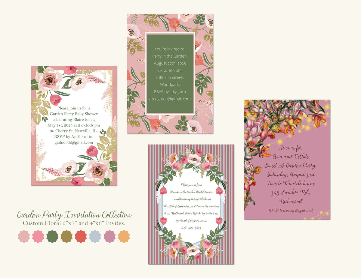 Custom Invitations "Garden Party" series, illustration and design.